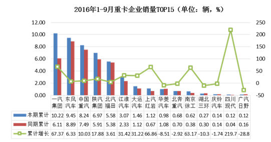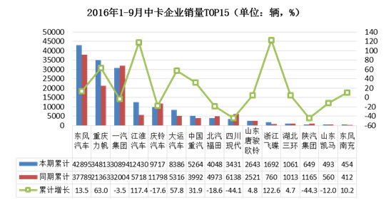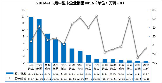 2016年1-9月中重卡企業(yè)中,東風(fēng)汽車銷量排名第一,累計銷量達(dá)到13.74萬輛,同比增長8.47%;銷量前十五企業(yè)中,重慶力帆、上汽紅巖和南京徐工銷量增長較大,增幅均超過60%。
