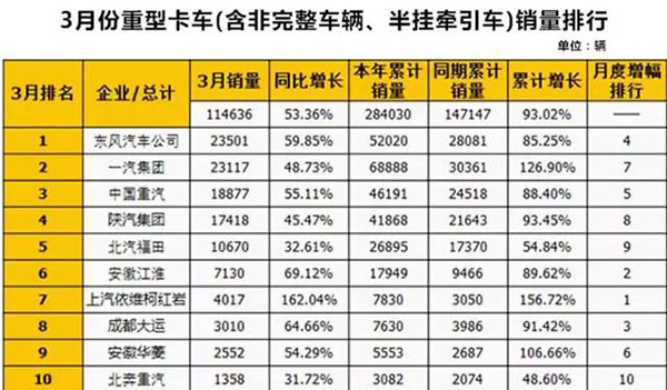 3月份,重卡市場的好勢頭繼續(xù),5家企業(yè)銷量過萬,東風(fēng)和一汽甚至雙雙突破2萬輛。銷量前十企業(yè)全部實現(xiàn)增長,增幅均超過3成。